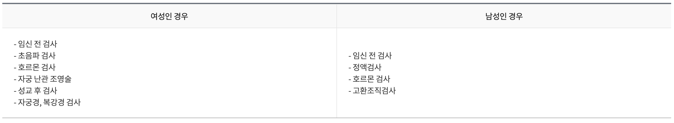 - 원인불명 난임(검사 결과 정상이나 1년 이상 임신되지 않는 경우, 부인이 35세 이상으로 6개월 이상 임신되지 않는 경우)