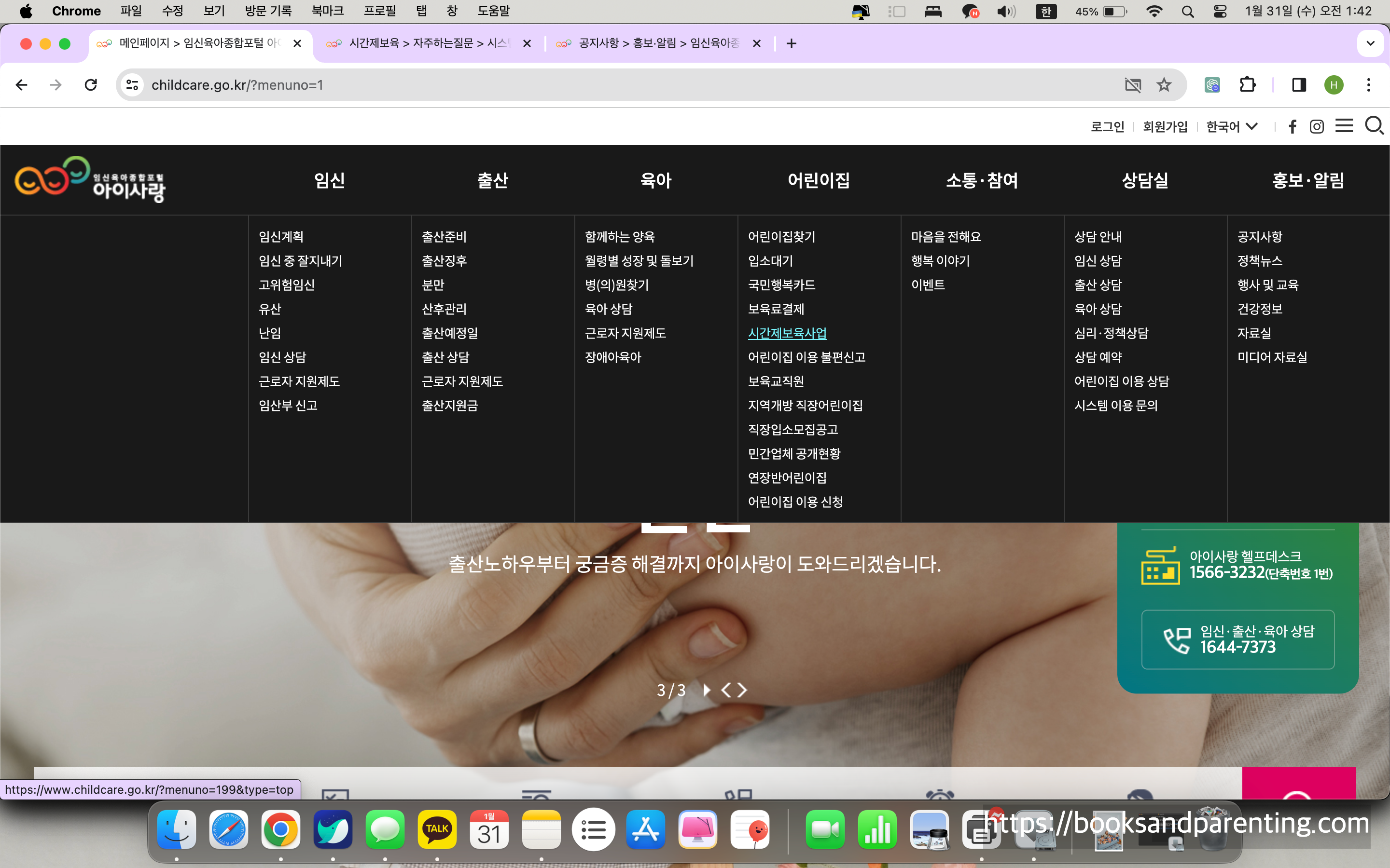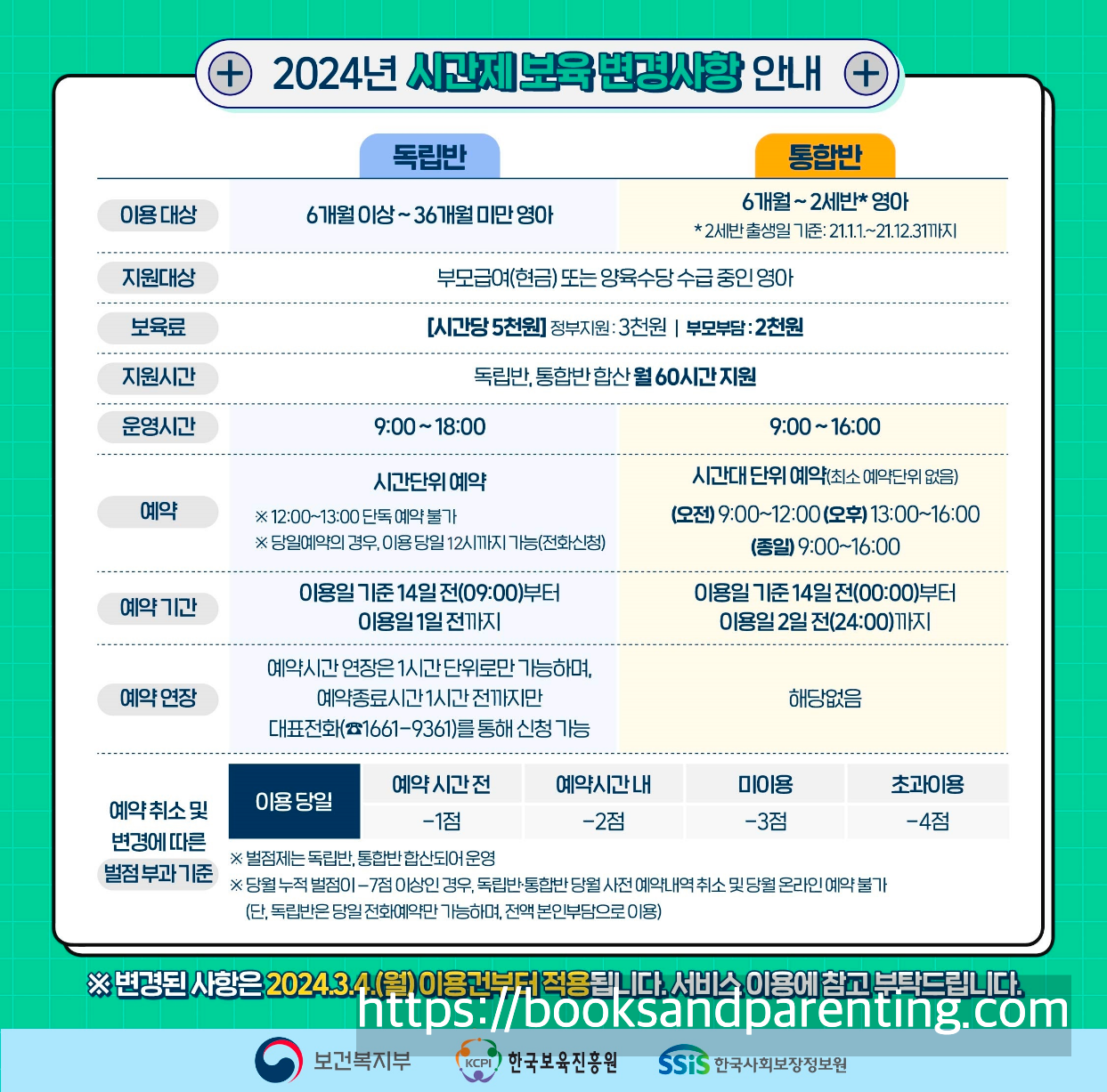 아이를 키우다 보면 '아, 딱 1-2시간만 아이를 좀 봐주었으면'하는 순간이 오기 마련입니다. 가정보육을 하는 중 다른 가족이 아이를 봐줄 수 없을 때, 급하게 병원에 가야 하거나 급한 볼일이 생겼을 때, 어린이집에 가지 않아 엄마가(혹은 아빠가) 자유롭지 못할 때 원하는 시간만큼 아이를 돌보아주는 국가 복지 서비스가 있다는 사실 알고 계셨나요! 이번 글에서는 시간제 보육 서비스 신청 방법 및 벌점과 같은 유의사항, 2024년 3월부터 변경되는 사항에 대해 포스팅해보고자 합니다.