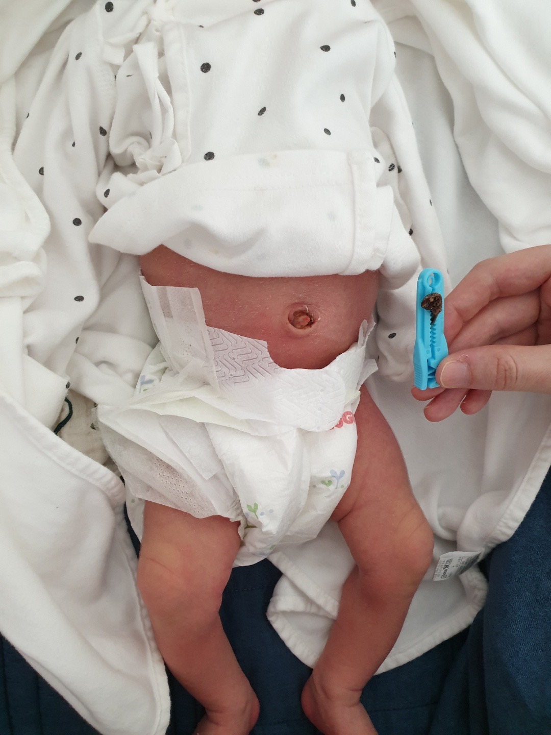 2) 탯줄이 떨어진 후에도 배꼽 부위가 여전히 약간 젖거나 투명하거나 약간 피가 섞인 작은 양의 배출물이 있을 수 있습니다. 이것은 정상이며 배꼽이 떨어지는 과정의 일부입니다.